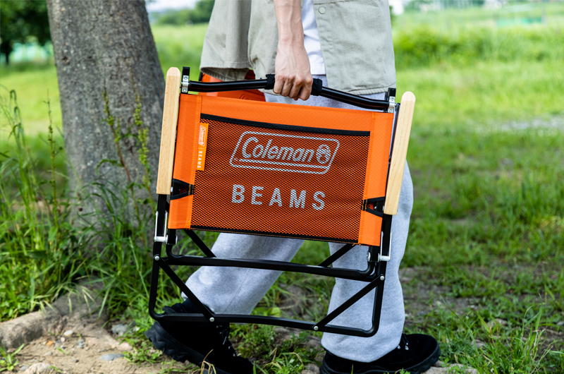 BEAMSの原点となる“BASIC & EXCITING”をプロダクトの視点で提案するレーベル、〈bPr BEAMS〉がアウトドアの雄〈Coleman(コールマン)〉に別注したフォールディングチェアは、別注のメリットを最大限に活かしたオリジナルにはない機能性を搭載。爽やかなオレンジが夏空に映え、拠点(サイト)の目印にもなる一脚です。