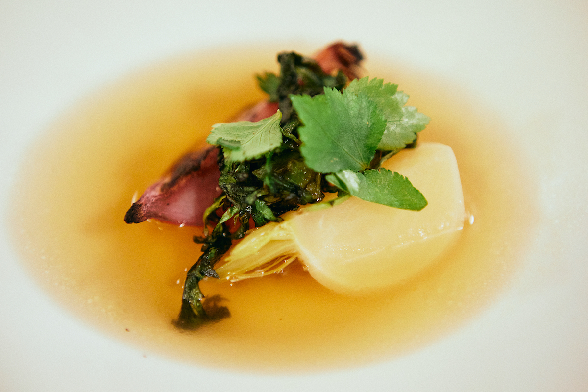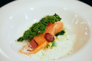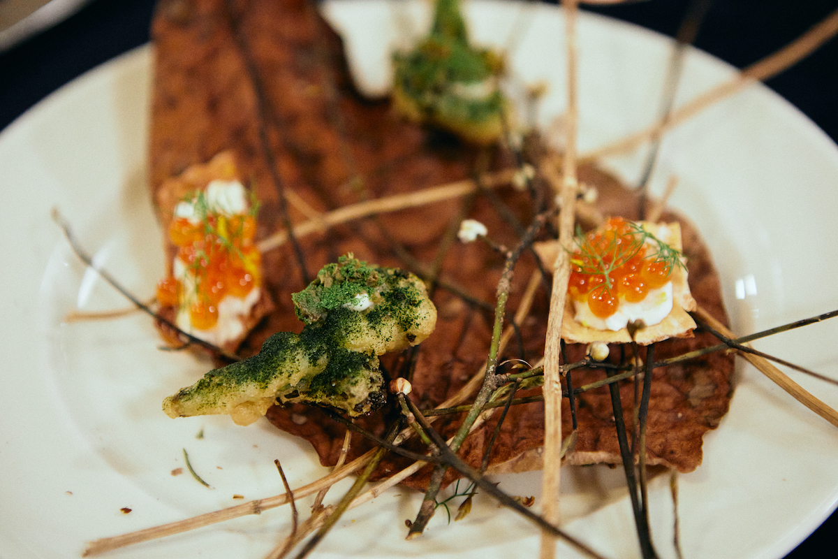 17時の日暮と共に料理が運ばれ、会食がスタートしました。内容は、山梨で採れた食材をメインとした創作料理に、アルコールまたはノンアルコールのペアリングを楽しめるといったもので、参加者は皆一様に、本格的なコース料理を思う存分楽しんでいました。