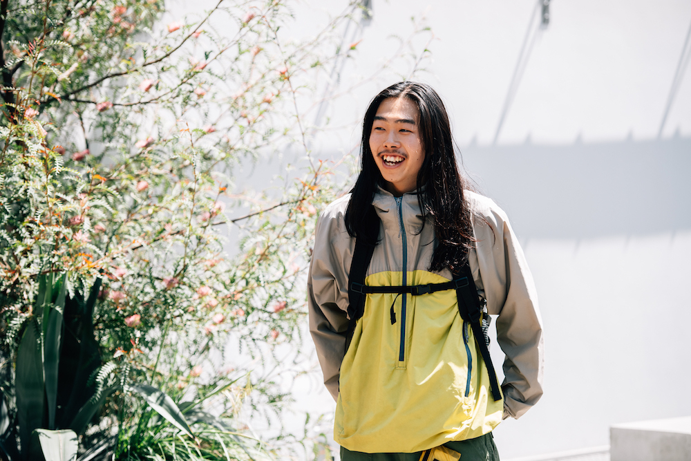 「ビームス 銀座」の永井陸さんは、インスタグラムの投稿のほとんどが山の写真という根っからの登山家。今回は、登山中にも愛用していると話す、2001年製の〈PATAGONIA ESSENTIAL〉のプルオーバーをメインアイテムにスタイリングを組んでもらいました。「古着特有のイエローを主役に、値段もお手頃な〈GRANITE GEAR〉のミニ財布を色を合わせてベルトから下げ、〈INOV-8〉の靴紐をイエローと相性の良いパープルに変えることで、“シティ”っぽさを演出しました!」。街着としての提案、ばっちりハマってます!