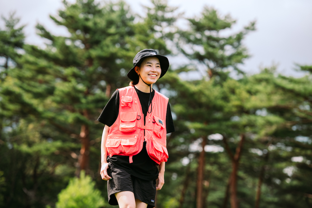 アウトドア女子のお手本のようなスタイルは、「ビームス」でプレスを務める渡邊かれんさん。ショーツは〈Patagonia(パタゴニア)〉、靴は〈Salomon(サロモン)〉、ハットは〈THE NORTH FACE(ザ・ノース・フェイス)〉というアウトドアブランドのトータルパッケージをブラックで統一しつつ、〈L.L.Bean(エルエルビーン)〉のピンクのベストでコーディネートを一気に華やかに。また、ベストの下に仕込んだTシャツは、「ADVENTURE SUMMIT 2023」の限定アイテム。背中に参加ブランドのロゴが入った一着は、アウトドアファン垂涎のデザインです…!