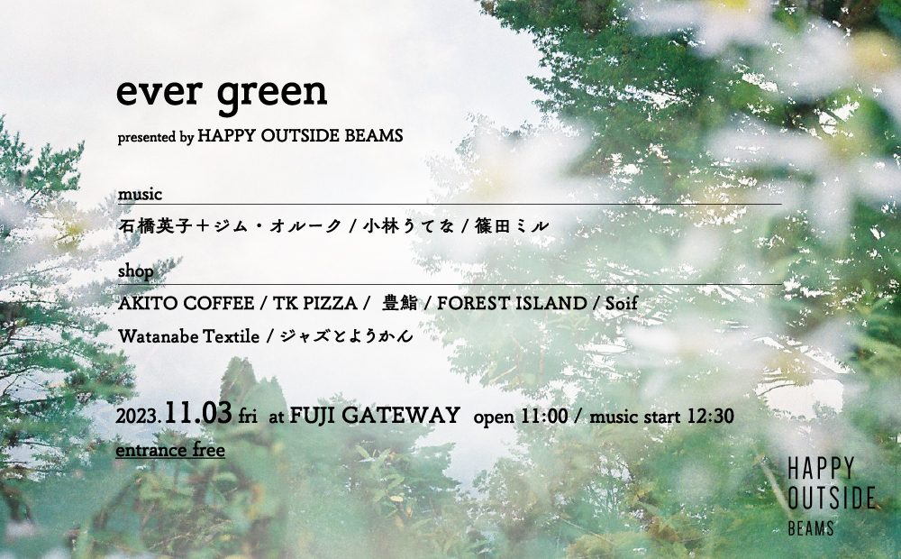 少し肌寒く空気が澄んでくる11月初め、自然の中で季節と一緒に『ever green present by HAPPY OUTSIDE BEAMS』を是非お楽しみください。