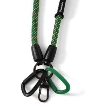 BEAMS別注のヨセミテストラップは、肩から掛けられる約120cmの長さにリングパーツと2つのカラビナ、さらにナスカンが付属。財布、スマホ、ポーチ、パスケース、ボトル、小型ライト、鍵、お財布、イヤホンケース、キーホルダーなどなど……「引っ掛けられるものならご自由に、何でも引っ掛けてください!」と言わんばかりの、懐の深いタフなロープとなっています。